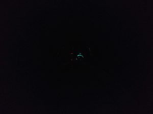 That picture was the our navigation lights reflecting back from the anchor on the bow roller – not much help for pilotage. We were very concerned about being able to dodge pot marker lines in the dark and had a powerful lamp at the ready by the wheel, but when we shone it around, all we saw was the glare from our rigging – another lesson in night navigation!